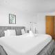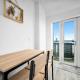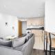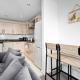 L’appartement dispose d’un agencement complet comprenant deux lits confortables dans ses deux chambres distinctes. La cuisine entièrement équipée comprend un réfrigérateur, un lave-vaisselle performant, une plaque de cuisson ainsi qu’un four et un micro-ondes. Un coin repas convivial accompagne ces installations culinaires modernes. Le séjour intègre aussi un coin salon avec canapé et télévision à écran plat dotée des services de streaming comme Netflix.